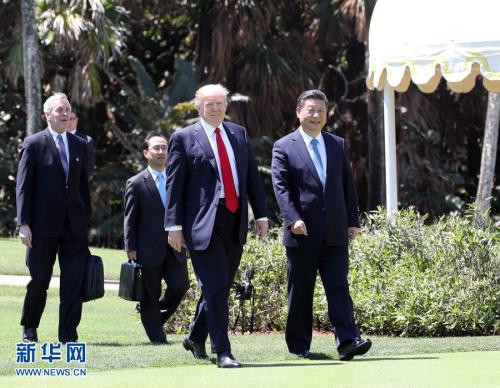 资料图:当地时间2017年4月7日,中国国家主席习近平在美国佛罗里达州海湖庄园同美国总统特朗普举行中美元首第二场正式会晤?;嵛詈?,习近平同特朗普到秀丽宜人的海湖庄园中散步,在轻松友好的气氛中继续就两国友好合作进行讨论。