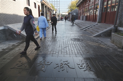 昨日,记者来到位于宣武门外大街的达智桥胡同。路口处几根石墩拦住机动车进出,还立起一座仿古牌楼,石板地上“达智桥胡同”五个大字古朴醒目。