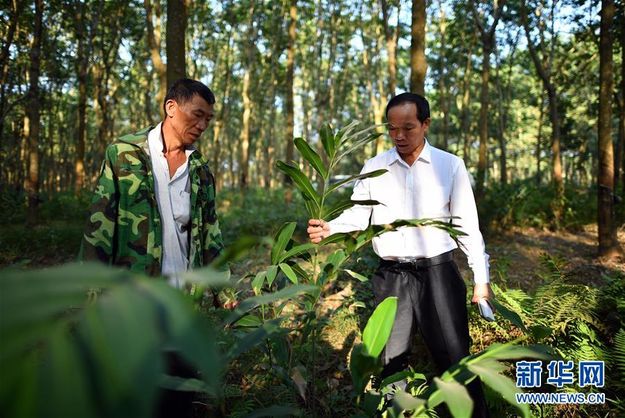 羊风极(右)在白沙黎族自治县打安镇龙凤村和砂仁种植户李日位交流(11月1日摄)。胶林翠绿、稻田金黄。海南省白沙黎族自治县打安镇的黎族群众,又迎来了一个收获的季节。打安镇福妥村的60多名党员、村干部和贫困户代表一大早聚集在村委会会议室里,聆听党的十九大代表、打安镇副镇长兼田表村党支部书记羊风极作十九大精神宣讲报告。新华社记者郭程摄