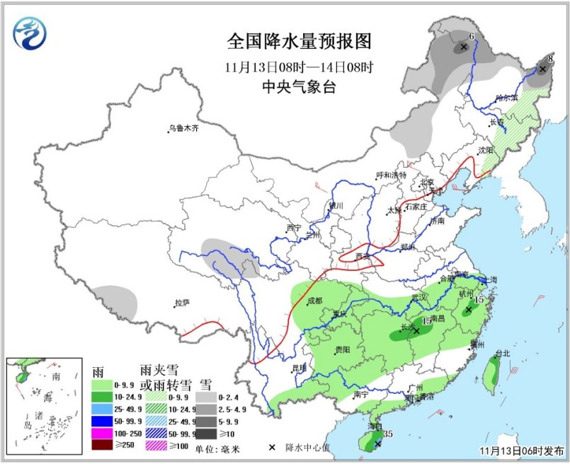 13日08时至14日08时,内蒙古中东部、黑龙江北部和东部、吉林东部、辽宁东部以及青海南部等地有小到中雪或雨夹雪,内蒙古东北部、黑龙江北部局地有大雪;西南地区东部、江淮南部、江南大部、华南沿海等地的部分地区有小到中雨,海南岛东部局地有大雨。内蒙古大部、华北及东北地区有4~6级风。渤海、黄海、东海、台湾海峡、南海、巴士海峡等地有5~6级风、阵风7级。