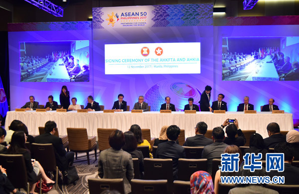 11月12日,在菲律宾马尼拉,中国香港特别行政区政府与东盟签署自由贸易协定与相关投资协定。新华社发(王玺摄)