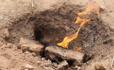 记者在现场看到,该空地大小约4平方米,地面有几个小坑,坑里有10处大小不一的火苗燃烧着。据了解,上世纪50年代,一石油开采队在此钻出了一口天然气井,由于量少没有开采价值,就把探测井给填了回去。填埋后,有些地方仍然冒出少量的天然气,后来此地50多年一直在冒火。