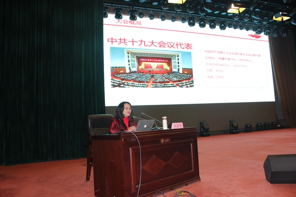中国社会科学院世界宗教研究所副所长、纪委书记、研究员、博士生导师郑筱筠应邀作了专题报告。在报告中,郑筱筠教授从三部分讲述了中共十九大精神。首先,从大会议程和会议日程安排方面介绍了中国共产党第十九次全国代表大会概况;其次,着重讲述了中共十九大报告的基本内容和会议精神,系统阐述了过去五年的工作和历史性变革、新时代中国共产党的历史使命、新时代中国特色社会主义思想和基本方略、新时代中国特色社会主义发展战略安排、坚定不移全面从严治党五方面基本内容和所蕴含的精神;最后,讲述了作为中共十九大代表的参会感受,提到中共十九大报告主题鲜明、内涵丰富、思想深刻,以新的历史方位统筹规划全局,围绕坚持和发展中国特色社会主义这条主线,深刻分析了我国发展新的历史方位,深刻把握了新时代的历史使命,全面阐述了习近平新时代中国特色社会主义思想,具有里程碑性质的重大意义。