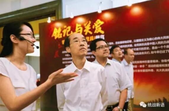 2015年 8月 20日,万鄂湘(左二)观看由团结报社举办的『铭记与关爱︱镜头中的抗战老兵』图片展