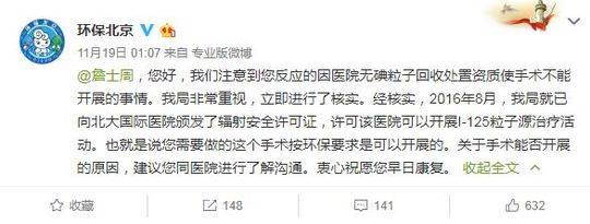 北京大学国际医院也于19日15:42 发布微博进行回应。据北京大学国际医院介绍,该院已取得环保部门颁发开展I-125粒子源治疗活动资质,正在申请取得卫生行政主管部门颁发的开展粒子治疗第三类技术资质的过程中,因此尚未与放射性粒子的生产和回收厂家建立业务联系。