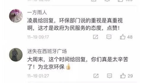 @环保北京赢得了很多网友点赞:“凌晨给回复,环保部门说的重视是真重视啊,这才是政府为民服务的态度?!薄拔本┗繁5愀龃蟠蟮脑?!”