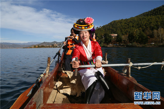 天刚亮,身着少数民族服饰的摩梭阿妹已在泸沽湖上划桨载客,纳西族汉子牵上马儿载客攀登玉龙雪山……