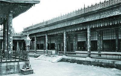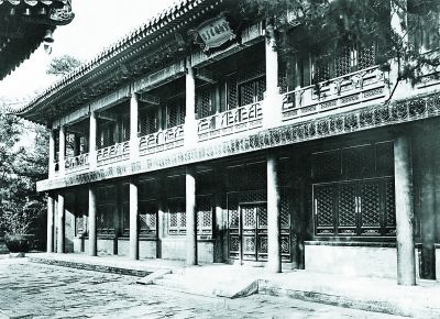 ▲漱芳斋是清帝宴集观戏之所。每年元旦,清帝要在此举行开笔仪式。元旦这天,皇帝着吉服于殿内升座,御案上陈设着金瓯永固杯,杯中注满屠苏酒,皇帝拿起“赐福苍生”笔,书就新年的第一字,是为“开笔”??仕橥歉!⒙?、寿、喜一类的吉祥文字,将其赏赐大臣、宗室、外藩,领受人视为无上的荣耀。本片摄于20世纪20年代。