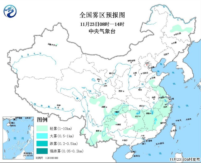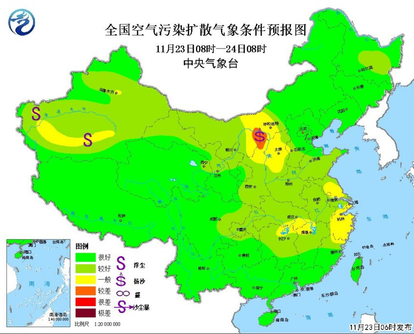人民网北京11月23日电(记者 白宇)23日,我国中东部地区继续有补充冷空气影响,全国大部地区大气扩散条件总体较好,江苏、浙江等地部分地区有轻度霾天气,随着冷空气南下会逐渐减弱消散。24日至25日,华北中南部、长三角等地静稳形势逐步建立。