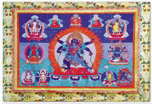 右手所持法器:象皮、铁钩、飞镖、骨架棒、天仗、木杵、水波利刃、轮盘、羂戈、铁斧、铁锤、矛、宝剑、金刚杵、箭、达玛茹。