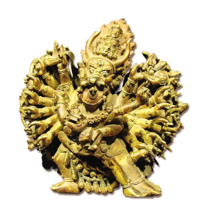 大黑天是梵语“玛哈嘎拉”的意译名,又译为“救怙主”,藏语称“贡?!薄K枪庞《鹊恼缴?,后被佛教吸收为护法神,颇受密教崇奉。大黑天的形象有多种,常见的有二臂、四臂、六臂像。该壁挂是六臂大黑天,是最常见的一种大黑天形象。
