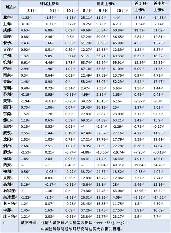 从半年房价累计涨幅看,始于2017年3月的新一轮各地房地产市场调控风暴,有效抑制了房地产泡沫的进一步扩张。大数据房价指数显示,2017年10月,样本城市中,有廊坊、北京、天津、上海、合肥5个城市,半年房价已分别累计下跌30.18%、14.53%、9.8%、2.14%、0.17%。另有苏州、深圳、厦门、郑州、南京、大连、太原、东莞等8个城市,半年房价累计上涨幅度控制在10%以内。