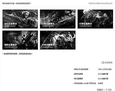 北青报记者在网站上看到,目前推出的英雄联盟课程共分为五个分科进行教学,其中单科课程内容涵盖10次导师一对一指导,永久免费观看英雄视频课以及每日直播课,并且有导师挑战赛的参赛权,课程价格为588元。此外,如果报名两门课程为888元,报名三门以上课程均为1288元。