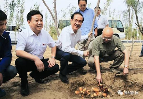 2016年9月6日,韩启德调研九三学社参与『一带一路』倡议社会服务工作,考察社员、北大药学院屠鹏飞教授在新疆的肉苁蓉种植基地