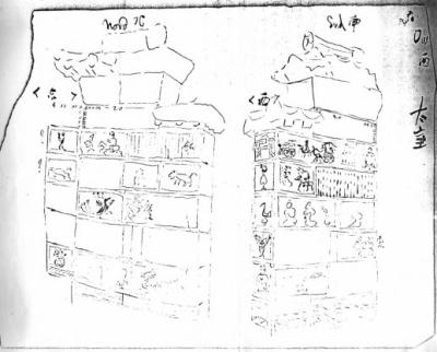 在鲁迅编辑整理的有关汉画像的遗稿中,存有鲁迅手绘的六张汉画像图。这些图是绘在大小不等的毛边纸上,每张图上均有鲁迅写的中外文手迹,其中两张图上标明“少室”;两张图上标明“太室”;还有两张,一张上写“东阙南面”;一张写“西阙北面”。这六张图画的是河南登封嵩山的少室阙、太室阙和启母阙,名为嵩山三阙。