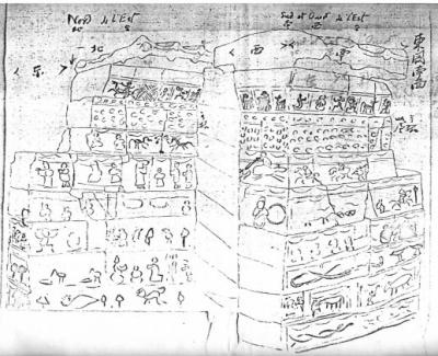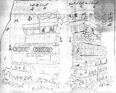鲁迅所拟《汉画象考》全书共8篇15卷。包含有阙、门、石室、食堂、摩崖、瓦甓等多种汉画像?!逗夯罂肌返摹暗谝黄本褪恰般凇保渲芯陀刑毅?、少室阙和开母阙(又称启母阙)。这嵩山三阙的拓本鲁迅得于1916年和1918年。1916年4月23日《鲁迅日记》中记有“午后往留黎厂买嵩山三阙拓本一分,大小十一枚,二元”又1918年6月4日,《鲁迅日记》记有:“午后往留黎厂德古斋买嵩山三阙画像拓本一份计大小三十四枚,券三十六元?!?920年4月8日又得到许寿裳赠嵩山三阙拓本五枚。这些拓本全部现存,见北京鲁迅博物馆编《鲁迅藏拓本全集﹒汉画像卷Ⅱ》。但鲁迅在1918年6月4日购买这嵩山三阙拓本34枚的前四天,即5月31日,曾从德古斋借来《嵩山三阙全拓》,当日《鲁迅日记》记有“由留黎厂德古斋假《嵩山三阙全拓》一卷而归”。此《嵩山三阙全拓》本,系清末精拓本,为清末民初旧装手卷一大卷,卷轴长13米,高45厘米,卷页面题“中岳三阙丙辰六月重装旧拓”。鲁迅绘的六张嵩山三阙图应当是从这本《嵩山三阙全拓》本中录出的。鲁迅的图描绘出三阙各自不同的造型,并录出阙上多方位的画像。在这六张图中不但有鲁迅亲笔所书阙名、还有鲁迅注明“未拓”“此层未拓”等字样,并详细的标明此图所绘的方位,如“西阙北面”“东阙南面”“东”“北”“西”“南”等等,详细注明所绘的图在该阙的方位。但令人不解的是,在图上有鲁迅用法文书写的“东南西北”,并在下面注上中文字。如有用法文写的“西南”“北、从东至西”“北东”“南,从西至东”下面也都注有中文字。从鲁迅对这些外文字母的书写特点与笔迹来分析,这些法文字确为鲁迅手迹。众所周知鲁迅精通日文与德文,至于为何要用法文标注该图的方位,本人未查出依据只得存疑。这六张鲁迅手绘嵩山三阙图手迹,现存国家图书馆。