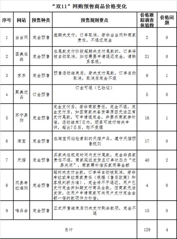 对129款预售商品价格行为调查体验情况来看来,预售商品价格相对规范。但也发现4款商品存在价格问题,如涉嫌以“划线价”形式虚构“原价”、预售价格不如双11当天价格优惠、预售价格频繁变化、定金随意变动。