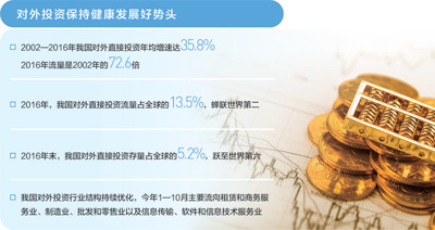 联合国贸易和发展会议《2017世界投资报告》显示, 2016年中国对外直接投资分别占全球当年流量、年末存量的13.5%和5.2%,流量位列全球国家(地区)排名的第二位,存量跃至第六位。
