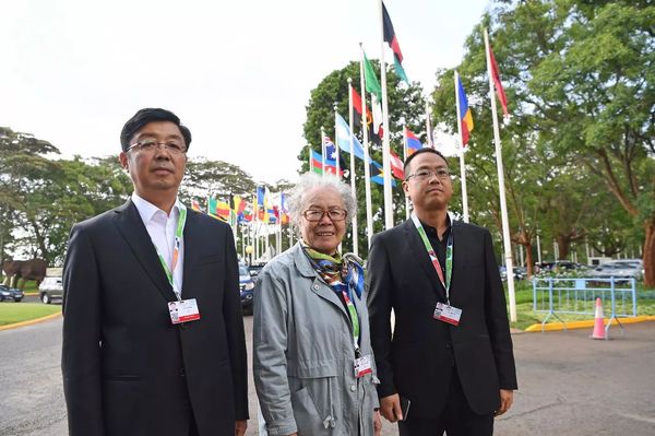 12月5日在肯尼亚内罗毕联合国环境规划署总部拍摄的塞罕坝林场老中青三代陈彦娴(中)、刘海莹(左)、于士涛的合影。 新华社记者陈诚摄