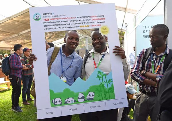 12月3日,在肯尼亚首都内罗毕,参会者在新浪微博展台合影留念。 新华社记者陈诚摄