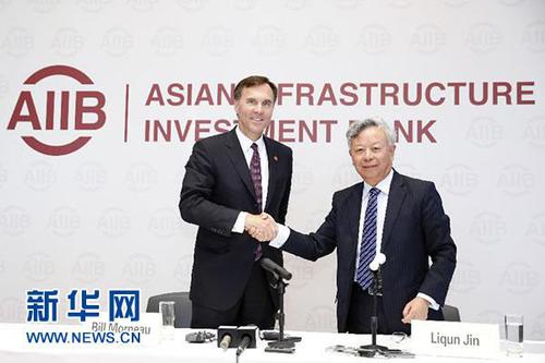 2016年8月31日,加拿大财政部长莫诺(左)与亚投行行长金立群在位于北京的亚投行总部出席新闻发布会后合影。 新华社记者 沈伯韩 摄