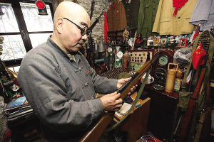 走进倪国英老人的家,让人仿佛“穿越”回了抗战年代,十几平方米的屋子里,木格门、青砖地、土炕……千余件“宝贝”把人一下子拉进一条时间密道??醋虐寺肪木?、牛皮帆布子弹夹、红军斗笠、军事地图,还有老电报机和冲锋号……每一件藏品背后都有一段故事。
