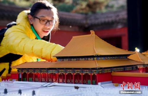今年11月底,这个虚拟故宫通过3D打印技术成为“微缩紫禁城”模型,在故宫博物院展出。图中模型后的人即为“喵奏”。中新社记者 杜洋 摄