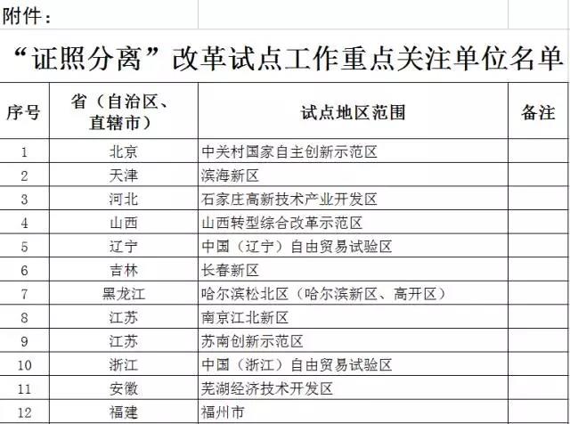 二、 结合各地改革推进情况,总局选取了31个 “证照分离”改革试点工作重点关注单位。请各省、自治区、直辖市工商和市场监管部门加大对这些重点关注单位的工作指导力度,着重在分类推进审批方式改革、推动部门信息互联共享、构建事中事后监管体系等方面积极试点,大胆探索,加快推进“证照分离”改革。