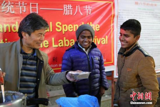 1月5日是农历十二月初八(腊八节)。中资企业在尼泊尔首都加德满都主要商业区泰米尔和博达哈大佛塔向民众赠送腊八粥。尼泊尔天利出版文化公司总经理陈小双表示,赠送腊八粥可以向大家传播中国传统文化。图为泰米尔区的送粥现场。中新社记者 张晨翼 摄