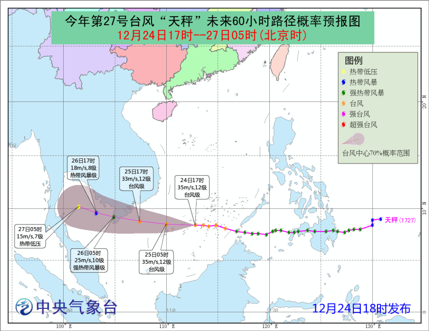 人民网北京12月25日电 今年第27号台风“天秤”的中心24日下午5点钟位于我国永暑礁偏南方约135公里的南海西南部海面上,就是北纬8.4度、东经112.8度,中心附近最大风力有12级(35米/秒),中心最低气压970百帕。