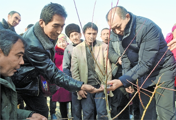 12月7日,自治区林业厅驻乌什县奥特贝希乡库木布隆村“访惠聚”工作队队员李志程(右)给村民讲解冬季苗木管理知识。记者邹懿摄