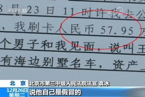 北京市第三中级人民法院法官 袁冰:在约见到第三个婚托的时候,在聊天过程中,被害人向这个婚托说了自己交纳了58万元的会费,婚托听说交纳如此这么多的这个高额的会费以后,当时良心发现,就告诉了本案的被害人,说他自己是假冒的,被害人在得知这个情况以后发现自己被骗,然后向公安机关报案的。
