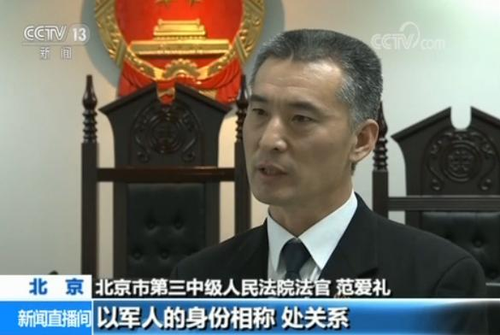 北京市第三中级人民法院法官 范爱礼:上过大学没有当过兵,但是他通过网络订了一些军队的军服,军帽和一些标志,包括军衔、军种的臂章,还有军官证,在公共场合和这个被害人以军人的身份相称、处关系。