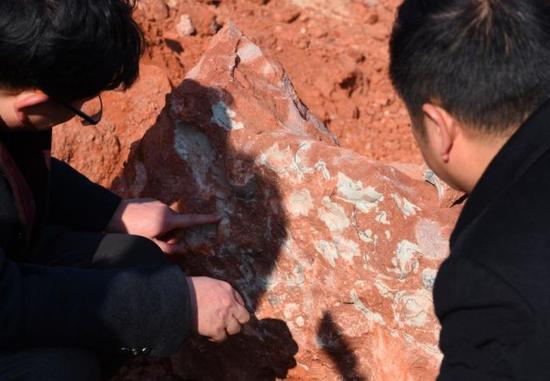 当天上午11时许,施工人员准备对爆破后的大石块进行分解时,发现石块中间嵌着一些椭圆形的石头和厚度约2毫米的黑色碎片,觉得很像恐龙蛋化石但又不能确定,于是立即报警求助。当地派出所民警赶到现场后,也认为石块内的镶嵌物疑似恐龙蛋化石,立即拉起警戒线?;は殖〔⑼ㄖ孟夭┪锕菸奈锉;すぷ魅嗽?。