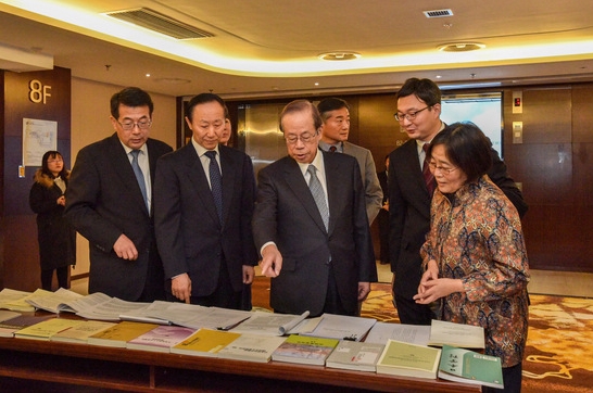 全国政协副主席、中国宋庆龄基金会主席王家瑞,日本前首相福田康夫参观第八届“孙平化日本学学术奖励基金”获奖作品展
