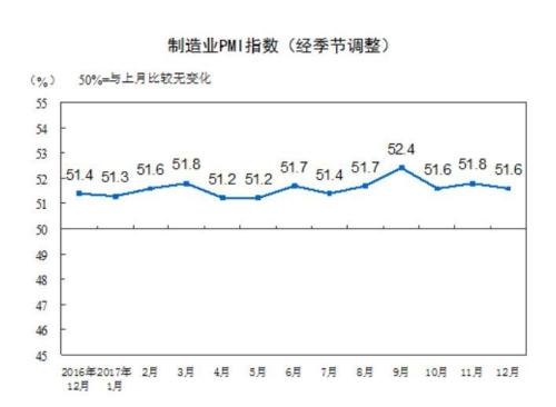 2017年,制造业PMI总体走势稳中有升,年均值为51.6%,高于上年总体水平1.3个百分点,制造业稳中向好的发展态势更趋明显。