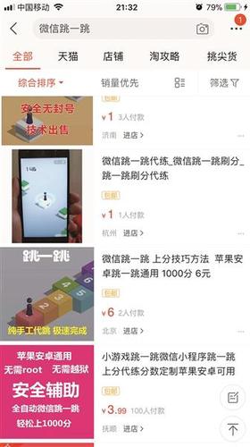 近日,一款名为“跳一跳”的微信小游戏在朋友圈里走热,受到大家追捧。游戏规则很简单,玩家控制游戏中的黑色小人,在不同形状的“箱子”间跳跃,根据跳跃的总步数获得排名。分数排行榜每周更新一次,这激发了一些玩家的刷分热情。北京青年报记者调查发现,在此期间,部分商家找到“商机”,出售“跳一跳”的代玩服务,买家花费数十元,即可刷到500分以上,挤进朋友圈前几名。