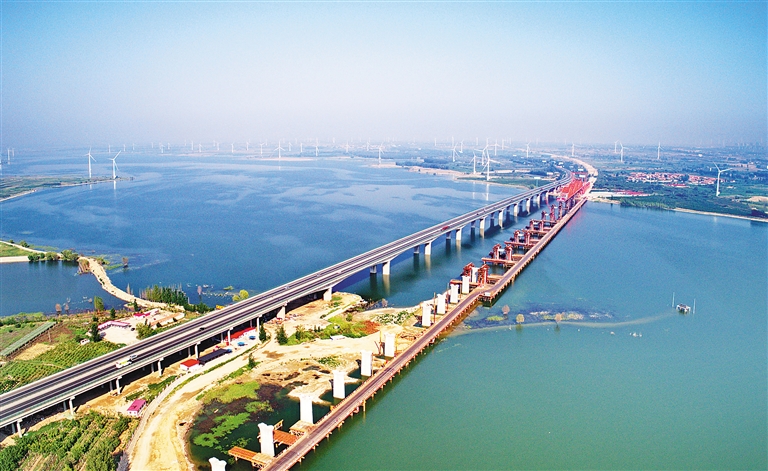 建设中的京张高铁工程官厅水库特大桥。新华社发