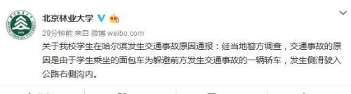 中新网1月3日电 据北京林业大学官方微博消息,2017年12月31日哈尔滨发生1起交通事故,导致北京林业大学9名女生4死5伤,经当地警方调查,交通事故的原因是由于学生乘坐的面包车为躲避前方发生交通事故的一辆轿车,发生侧滑驶入公路右侧沟内。