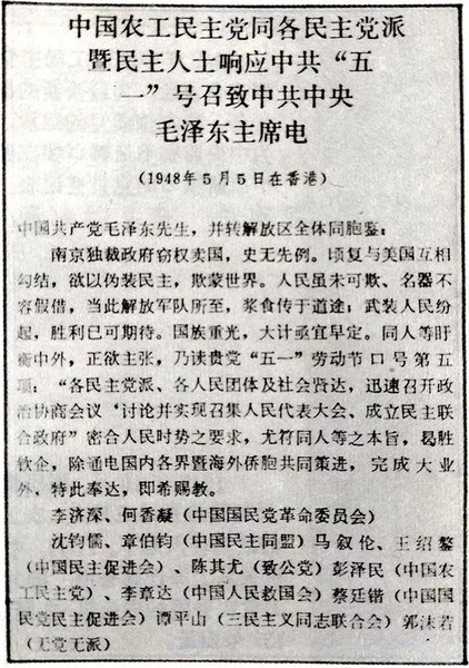 1948年5月,农工党同各民主党派和无党派民主人士代表,为响应中共中央的“五一”号召,联合致毛泽东主席电