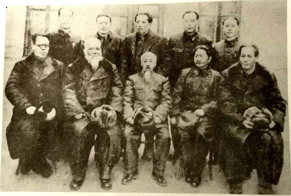 1948年9月29日,第一批由香港北上参加新政协筹备会议的民主党派人士沈钧儒、章伯钧、谭平山、蔡廷锴四人到达哈尔滨。图为9月30日章伯钧(后排中)与(前排左起)李立三、谭平山、沈钧儒、李德全、蔡廷锴等在哈尔滨合影。
