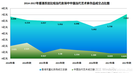 通过统计指标拍卖行的数据显示,在成交量与上年基本持平的情况下,2017年中国当代艺术家的成交额为12.17亿元,同比下降了近13%,其中香港市场成交额为4.29亿元,占比为35.26%,同比下调17%;大陆成交额为7.88亿元,同比下降11%。