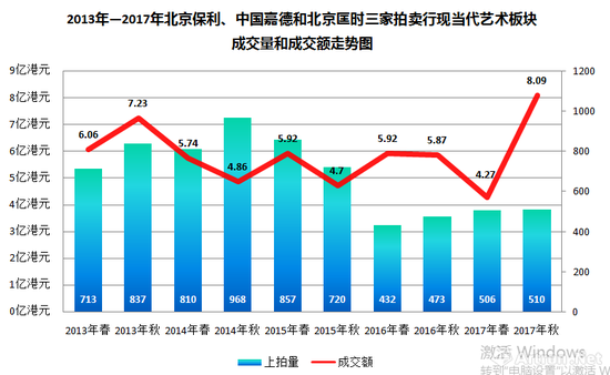 图表-5 2013年——2017年春北京保利、中国嘉德和北京匡时三家拍卖行现当代艺术板块成交量和成交额走势图(数据来源\制图:雅昌艺术网)