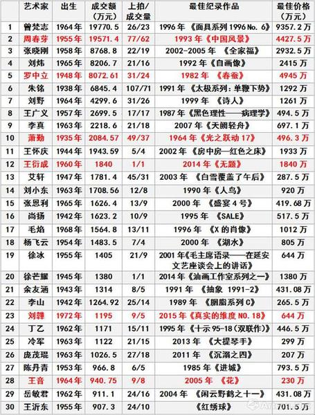 此外,2017年表现明显回暖的艺术家还包括:罗中立(4-6-14-未上榜-5)、刘野(5-14-19-24-7)和王广义(未上榜-21-27-21-8)。