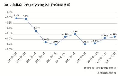 “3·17”新政出台后,随着北京二手房市场的快速冷却,北京二手房价随之下跌。据伟业我爱我家市场研究院数据统计显示,北京二手房价在2017年4月份冲高企稳,并从5月份开始直至年底12月,迎来了连续8个月的回落,12月份的二手住宅成交均价较4月高点时相比已经累计下跌15%。