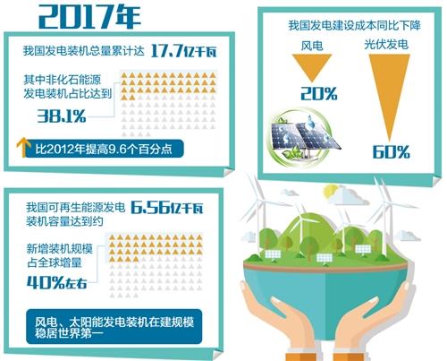 “2017年,我国发电装机总量累计达17.7亿千瓦,其中非化石能源发电装机占比达到38.1%,比2012年提高9.6个百分点,是历史上增长最快的时期?!惫夷茉淳志殖づぐ卓肆ν嘎叮?017年,我国可再生能源发电装机容量约6.56亿千瓦,新增装机规模占全球增量40%左右。风电、太阳能发电装机在建规模稳居世界第一,成为全球非化石能源发展的引领者。