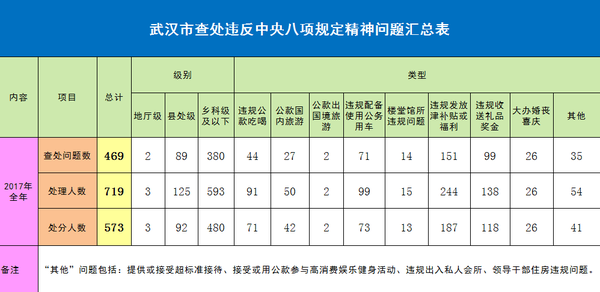 央视网消息:据中央纪委监察部网站消息,武汉市纪委狠抓中央八项规定精神贯彻落实,驰而不息推进作风建设,坚决防止“四风”问题反弹。2017年,全市共查处违反中央八项规定精神问题469件,处理719人,处分573人,通报曝光典型问题115批次343起519人次。