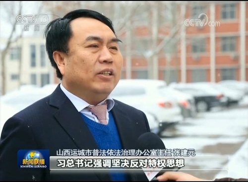 山西运城市普法依法治理办公室主任 张建元:习总书记强调坚决反对特权思想,坚决反对特权现象,我们基层的党员干部,应该在思想上、政治上、行动上,同党中央保持高度一致,严格践行“三严三实”,坚决遵守八项规定,从今天做起,从小事做起,从自我做起。