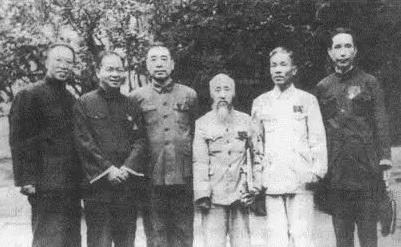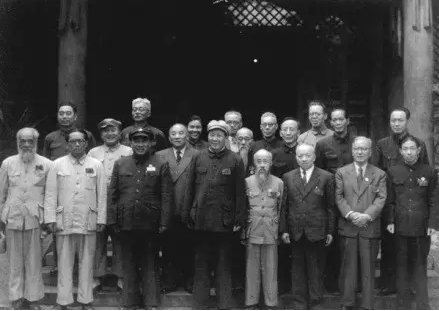 1949年7月5日,毛泽东、周恩来、朱德与新政治协商会议筹备委员会全体常务委员合影。前排左起:谭平山,章伯钧,朱德,毛泽东,沈钧儒,李济深,陈嘉庚,沈雁冰(茅盾)。二排左起:黄炎培,马寅初、陈叔通,郭沫若,蔡廷锴,乌兰夫。三排左起:周恩来,林伯渠,蔡畅,张奚若,马叙伦,李立三