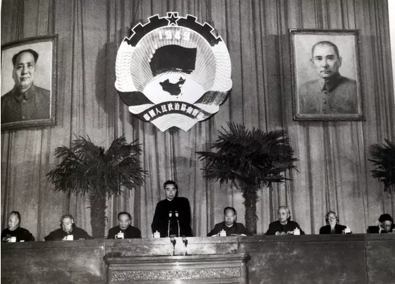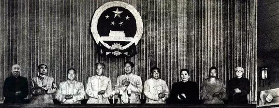 1954年,毛泽东、朱德、刘少奇、周恩来、宋庆龄、董必武、李济深、张澜、林伯渠等在全国人民代表大会第一次全体会议上